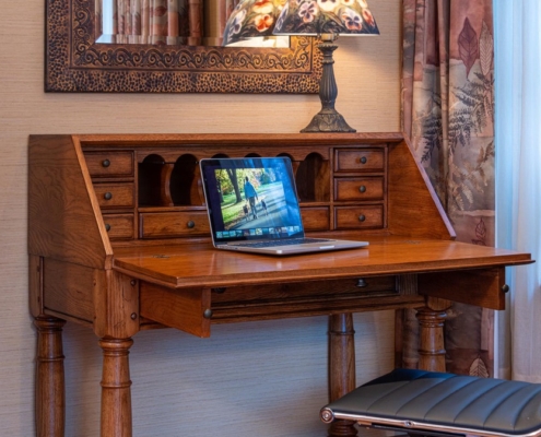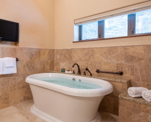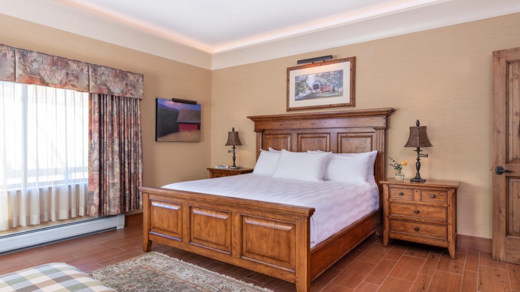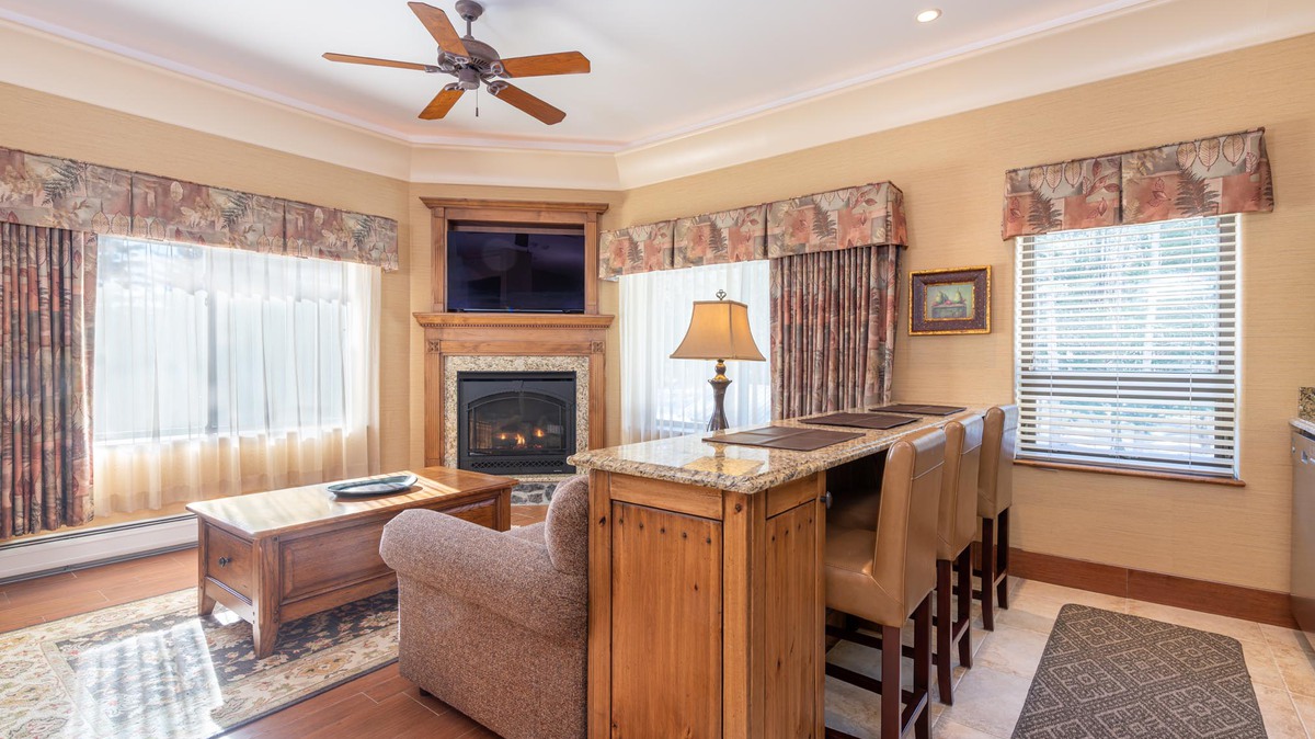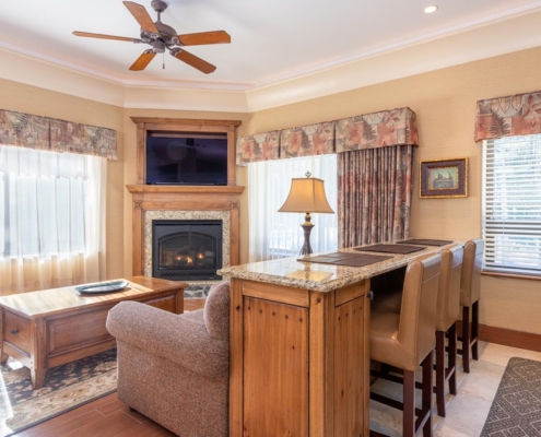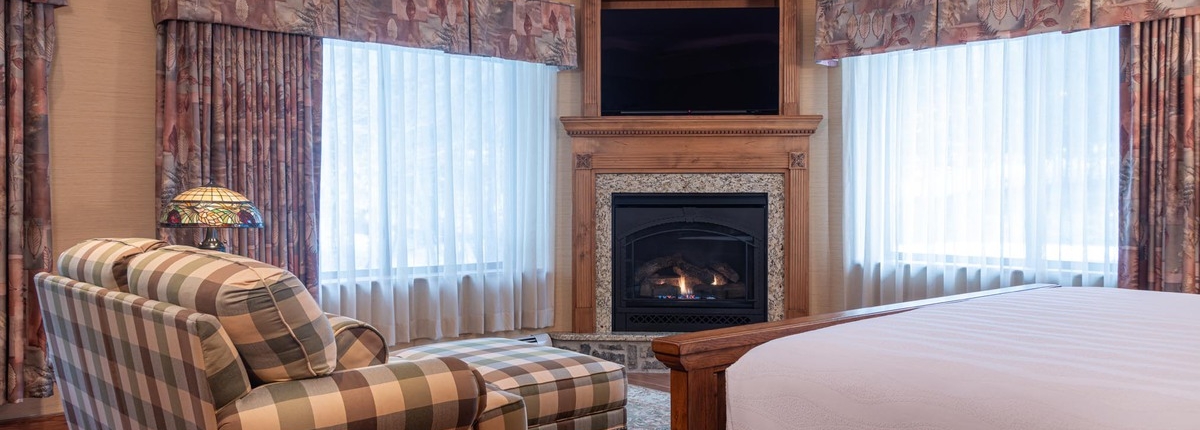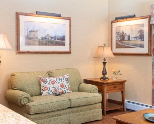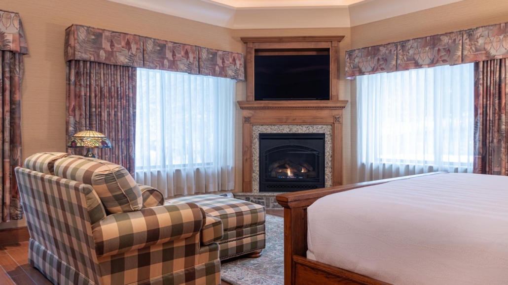 The living area of the suite includes a small kitchenette area with a full-sized refrigerator, sink, dishwasher, Keurig coffee maker, and microwave. The living room has a gas fireplace, flat-screen television, and views of our covered bridge. The large bathroom has a separate shower and soaking tub with air jets to soak away the day. The bedroom with its handsome king-size bed, sitting area with gas fireplace, flat-screen television, and working desk area overlook the pool patio, pond, and gardens.