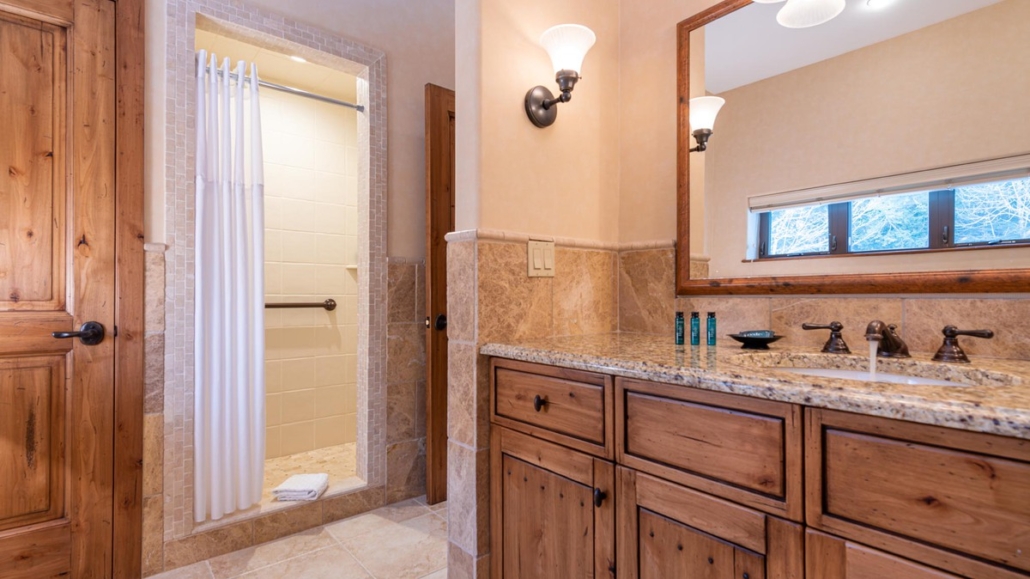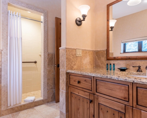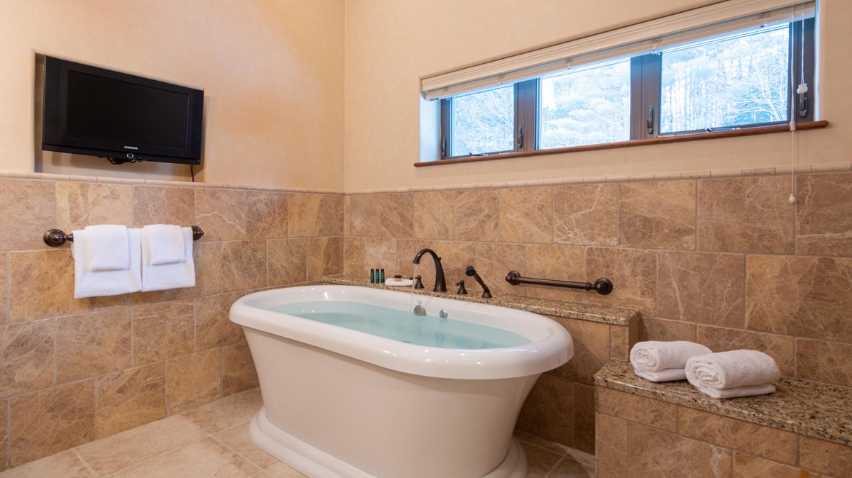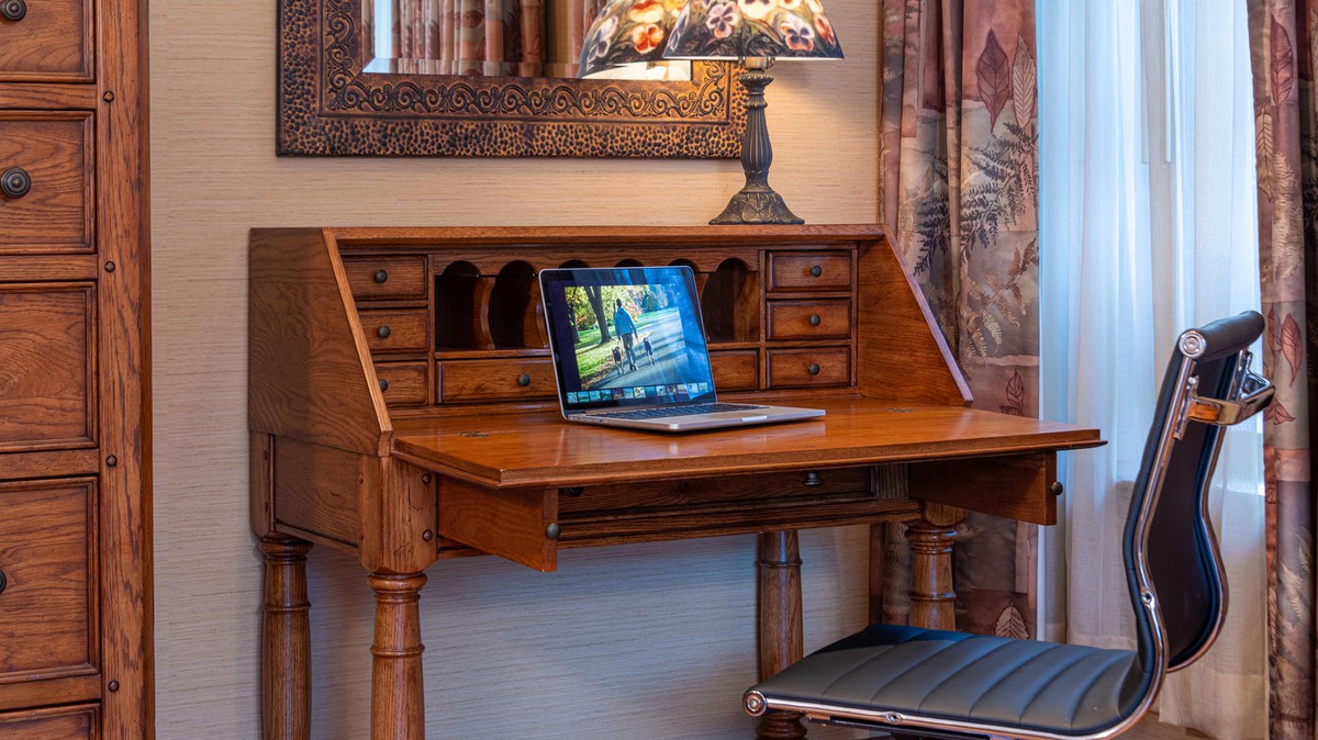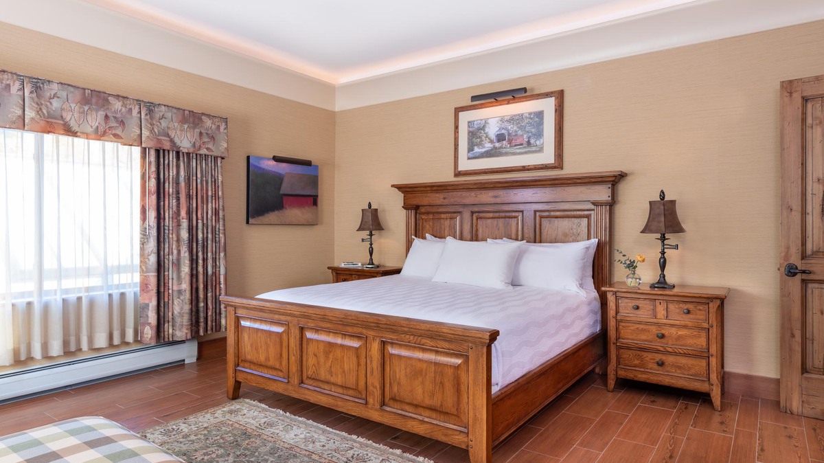 The living area of the suite includes a small kitchenette area with a full-sized refrigerator, sink, dishwasher, Keurig coffee maker, and microwave. The living room has a gas fireplace, flat-screen television, and views of our covered bridge. The large bathroom has a separate shower and soaking tub with air jets to soak away the day. The bedroom with its handsome king-size bed, sitting area with gas fireplace, flat-screen television, and working desk area overlook the pool patio, pond, and gardens.