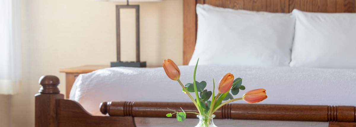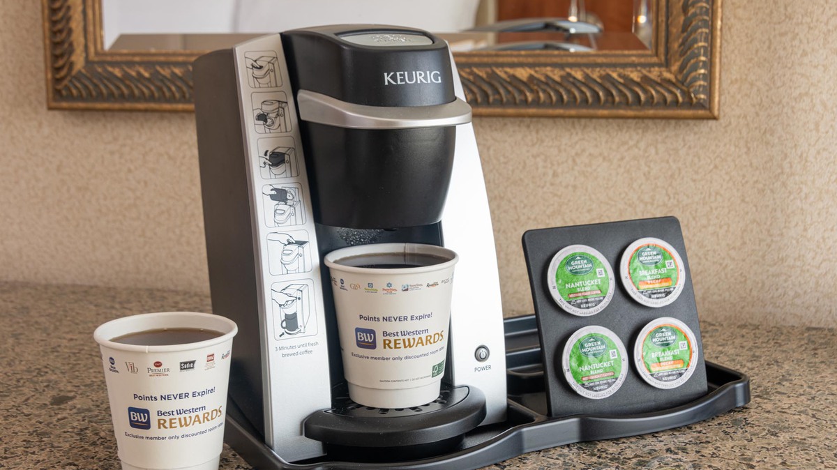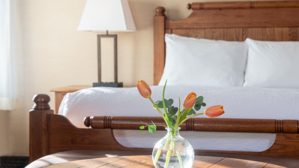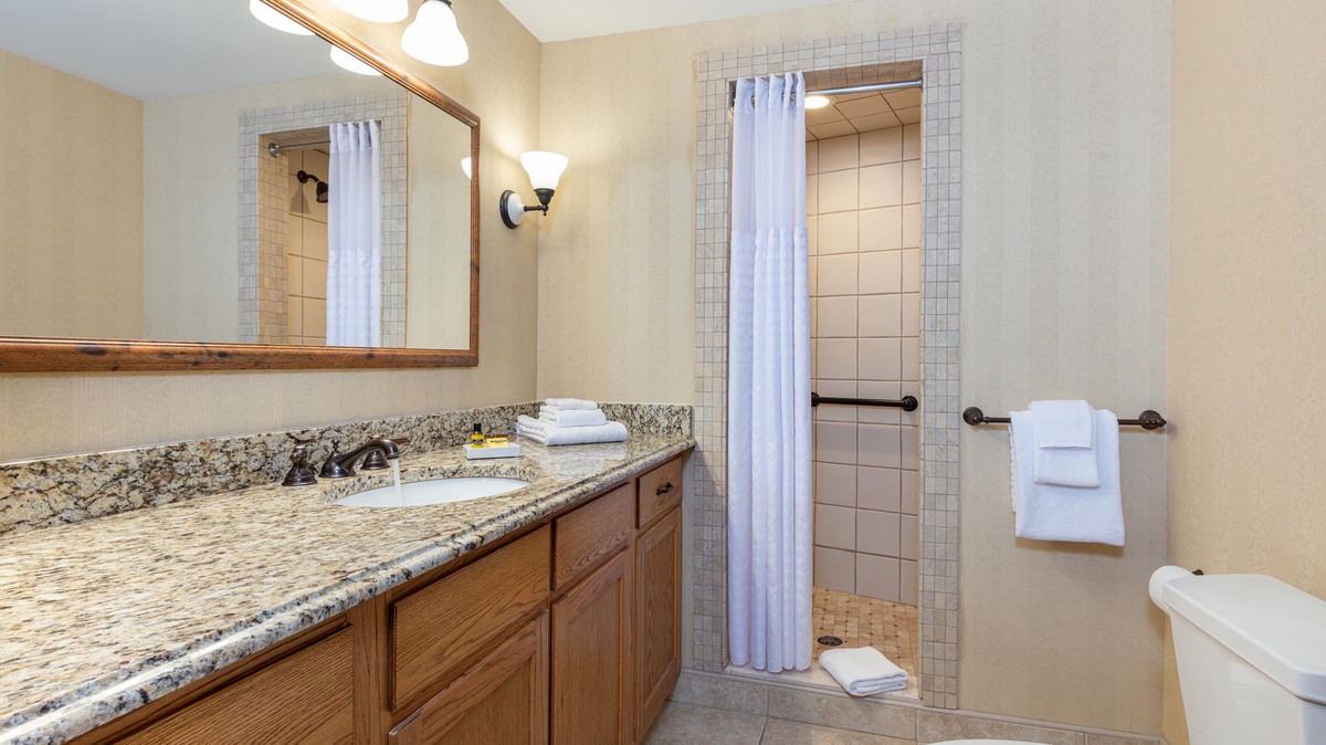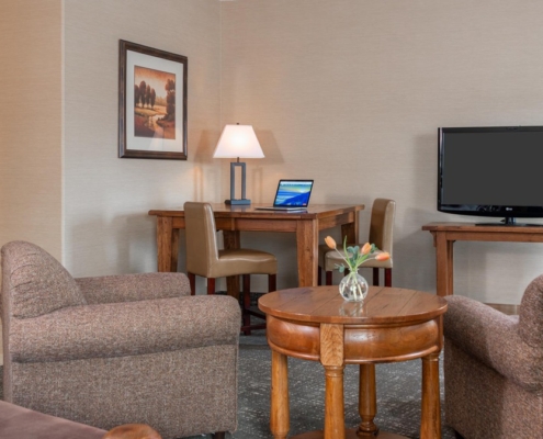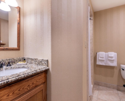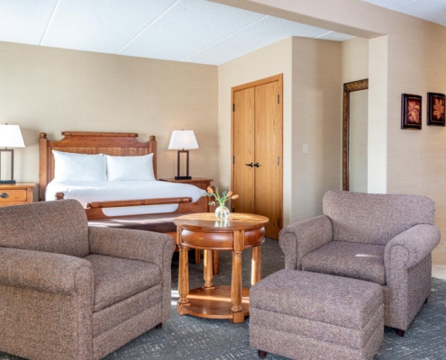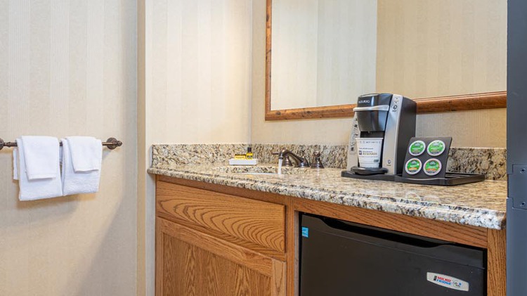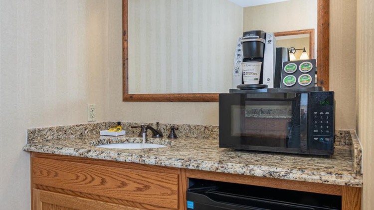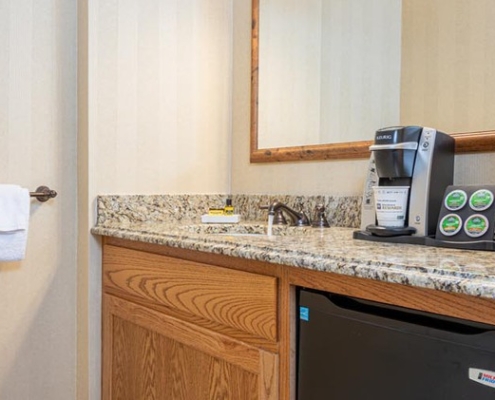 Our beautiful, oversized King Deluxe room includes an extra sitting area with large screen TV. It is a perfect spot to relax with your Keurig coffee and enjoy mountain views and plenty of space. This room boasts a high-top table with two stools for an easy workspace or eating area as well as a split bath with separate sinks.